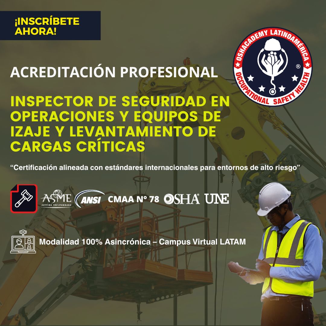 Los profesionales acreditados estarán registrados en la lista oficial de OSHAcademy Latinoamérica Training Center, lo que avala sus conocimientos y los califica para realizar inspecciones eficientes, garantizando la seguridad y efectividad en las maniobras de izaje de cargas críticas.